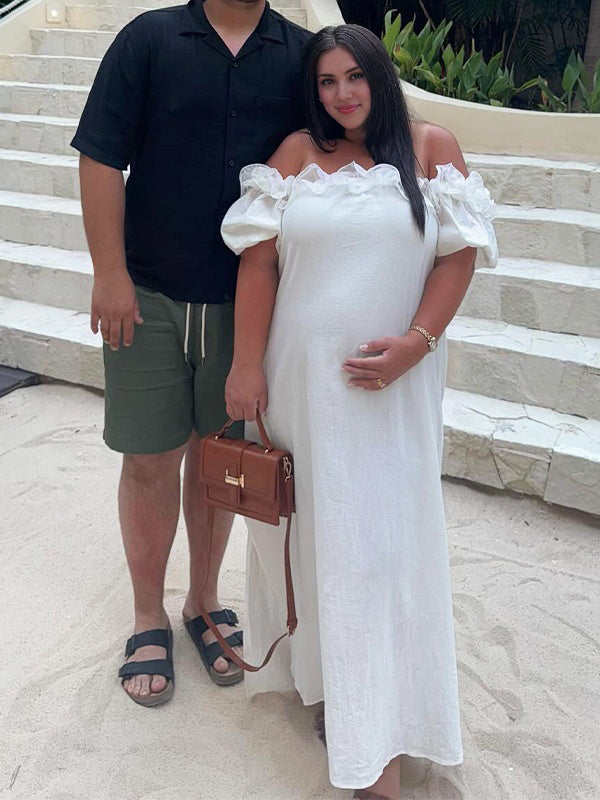 Momyknows White Off Shoulder Ruffle Side Slit Maternity Maxi Dress