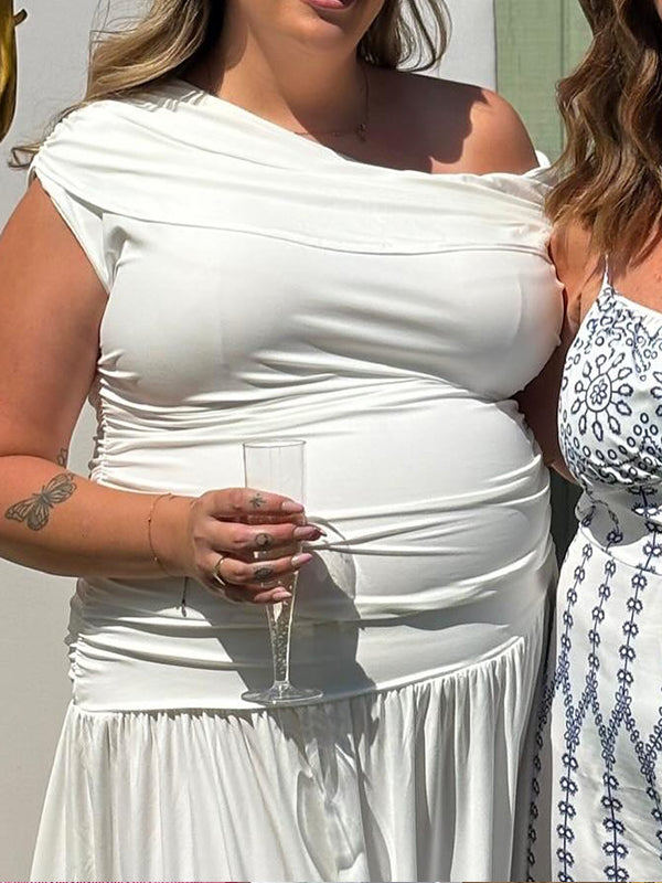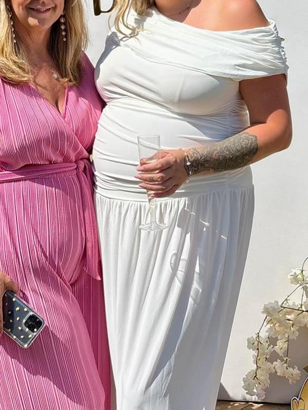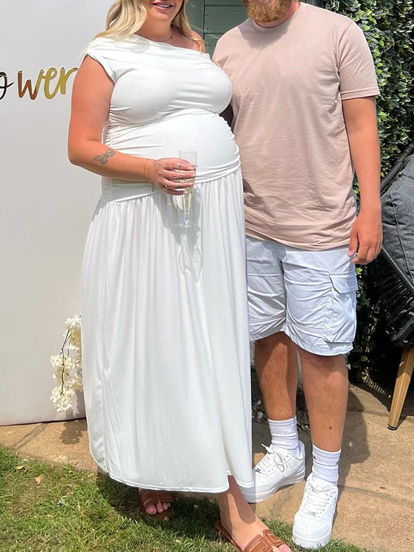 Momyknows White One Shoulder Ruched Pleated Big Swing Maternity Maxi Dress