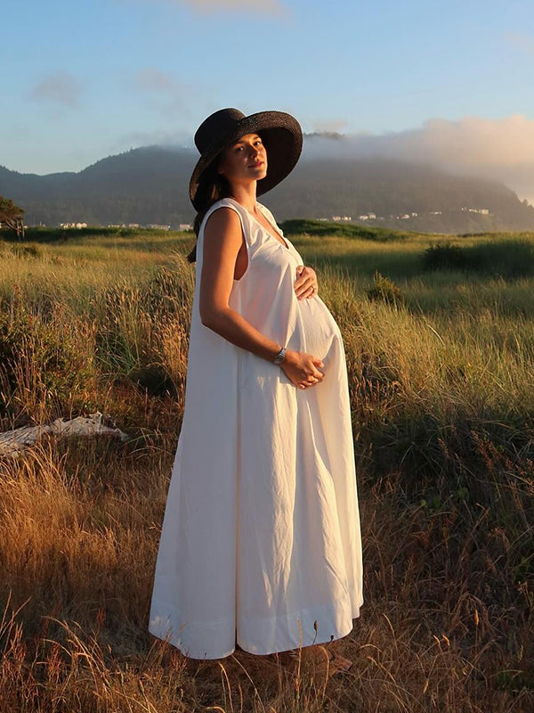Momyknows White Ruched U Neck Maternity Photoshoot Maxi Dress