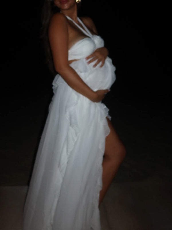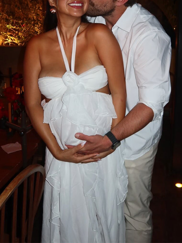 Momyknows White Ruffle 3D Flower Cut Out Maternity Maxi Dress