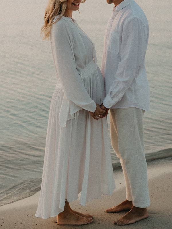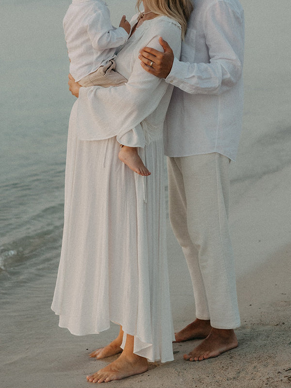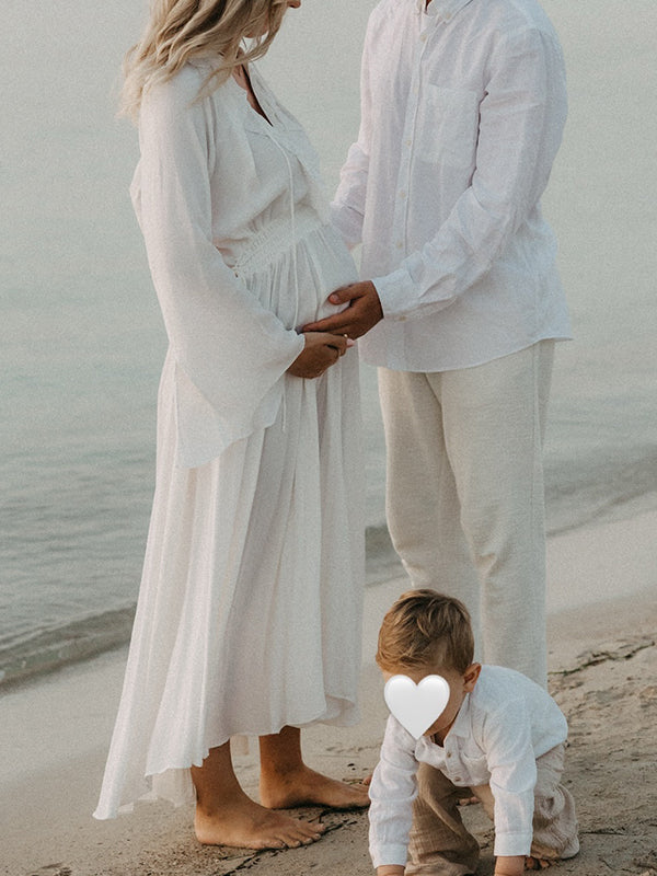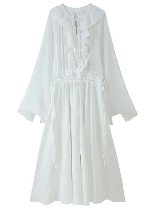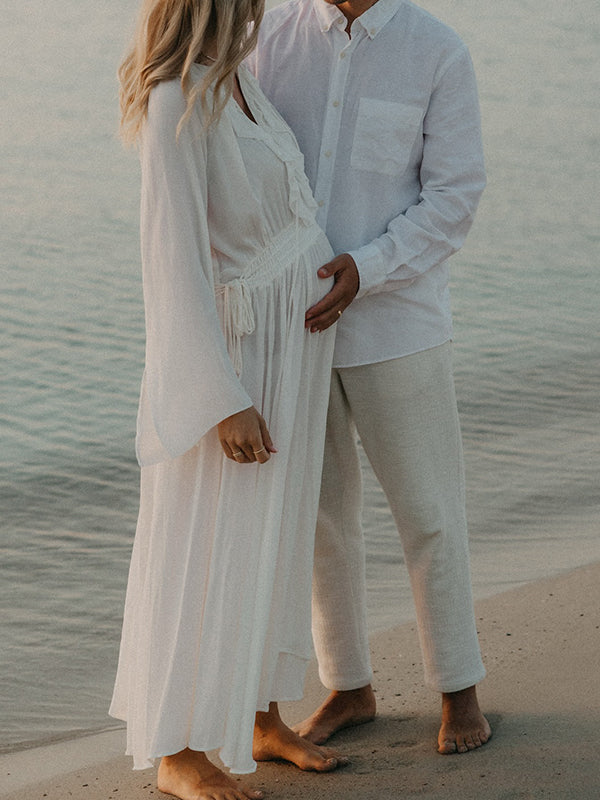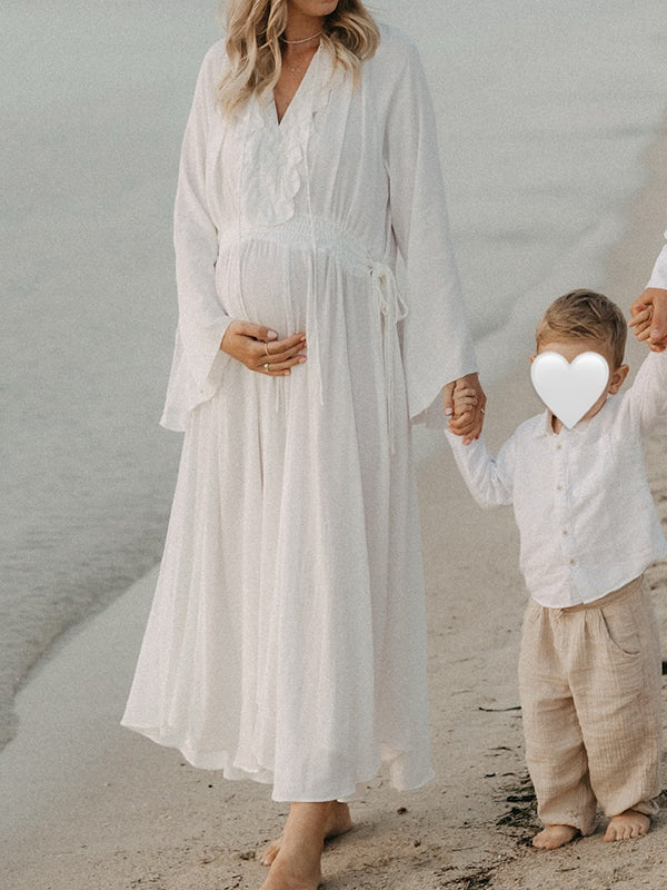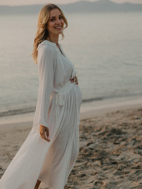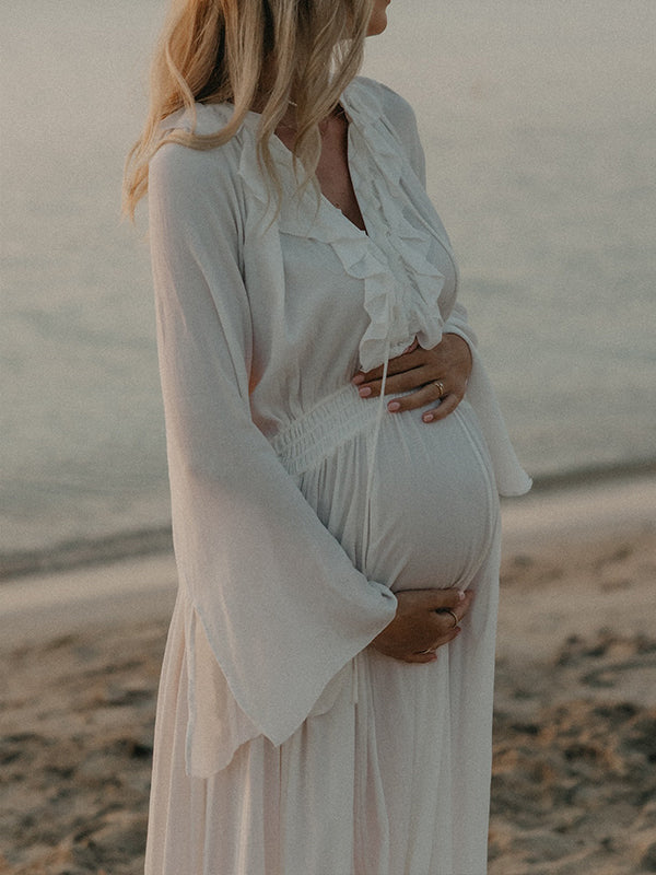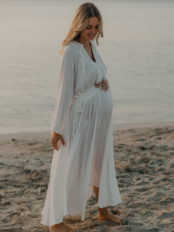 Momyknows White Ruffle Big Swing Ruched Boho Maternity Maxi Dress