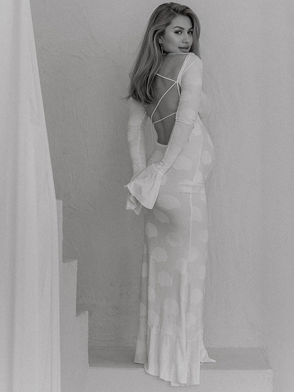 Momyknows White Shell Printed Backless Flare Sleeve Elegant Maternity Maxi Dress