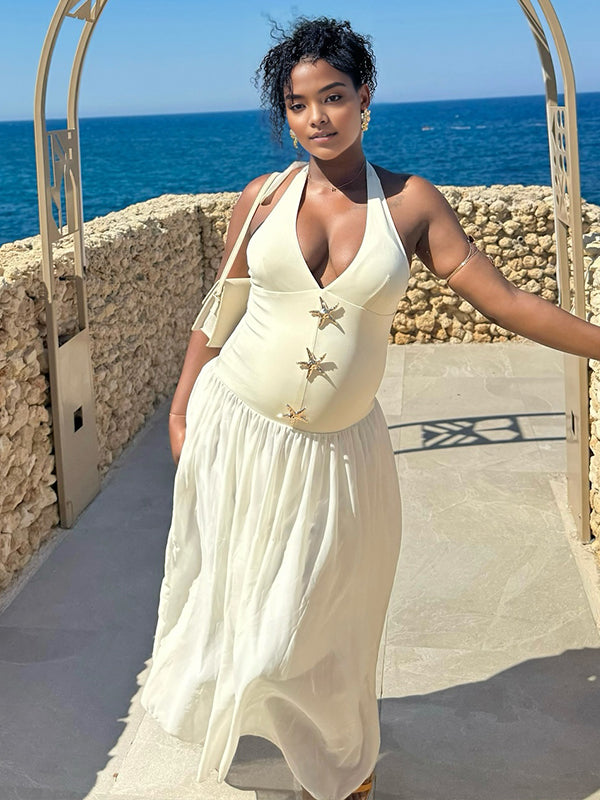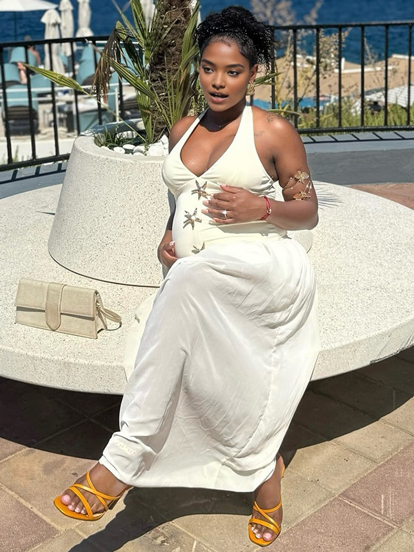Momyknows White Starfish Hardware Big Swing Halter Neck Maternity Maxi Dress