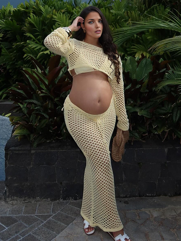 Momyknows Yellow Crochet Hollow Out Crop Backless Two Piece Set Cover Up Maternity Maxi Dress