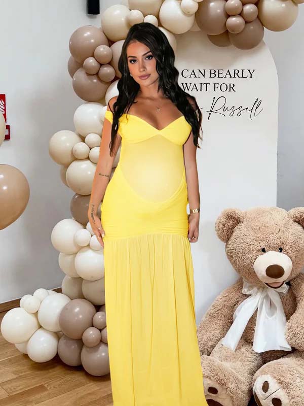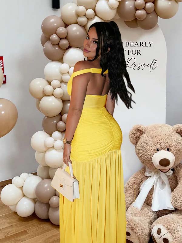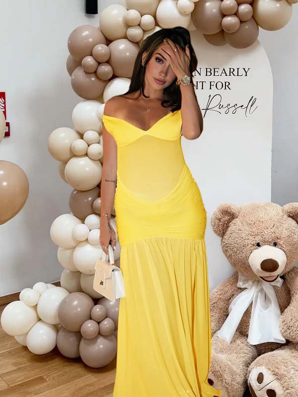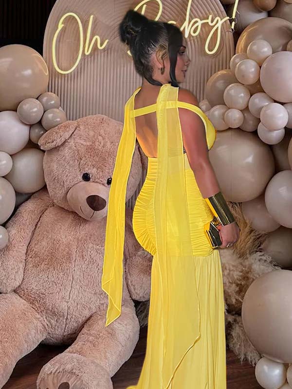 Momyknows Yellow Off Shoulder Mesh Ruched Side Slit Scarf Backless Maternity Maxi Dress