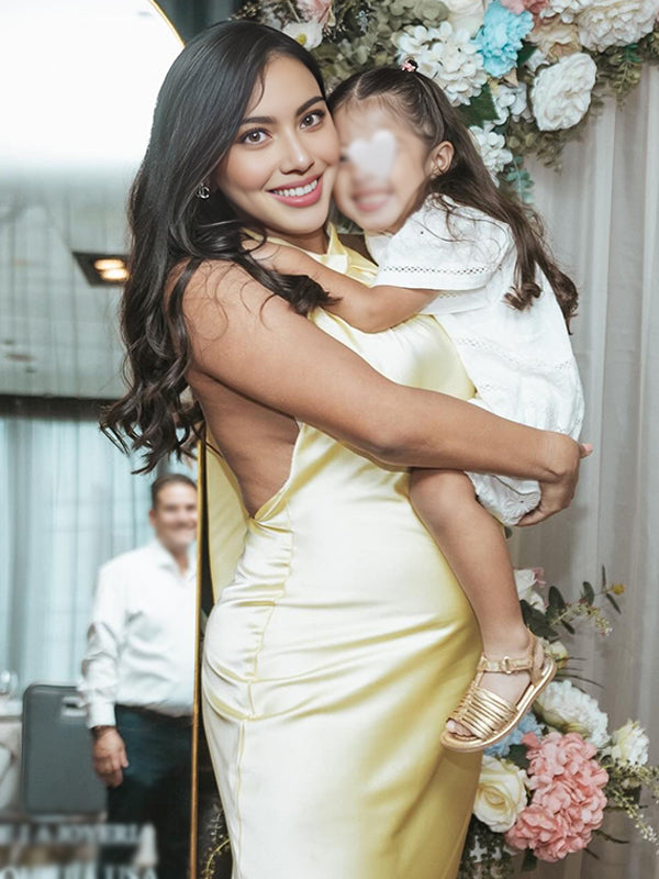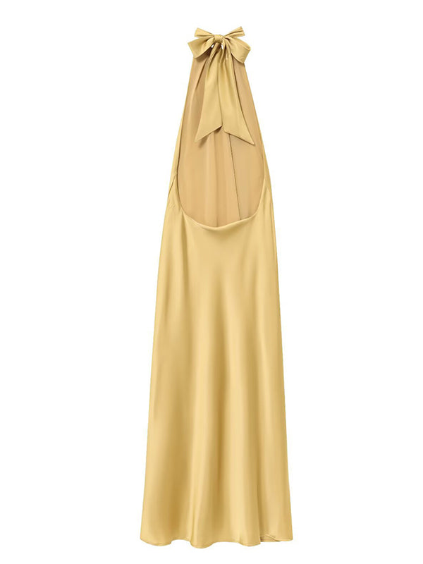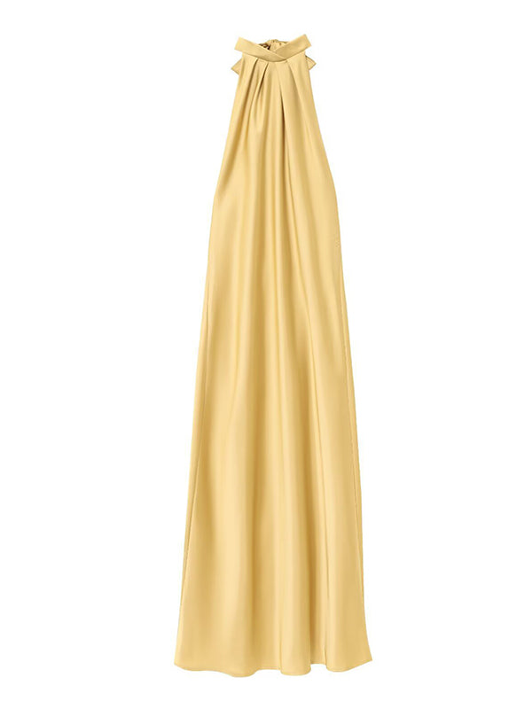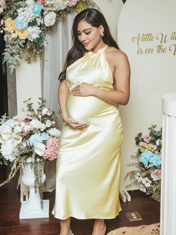 Momyknows Yellow Satin Tie Back Halte Neck Backless Maternity Maxi Dress