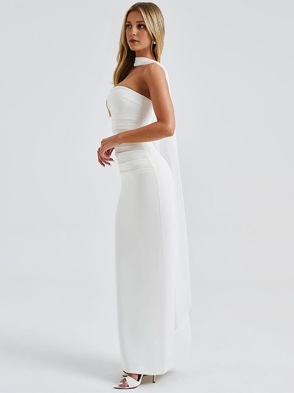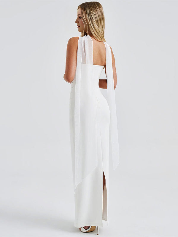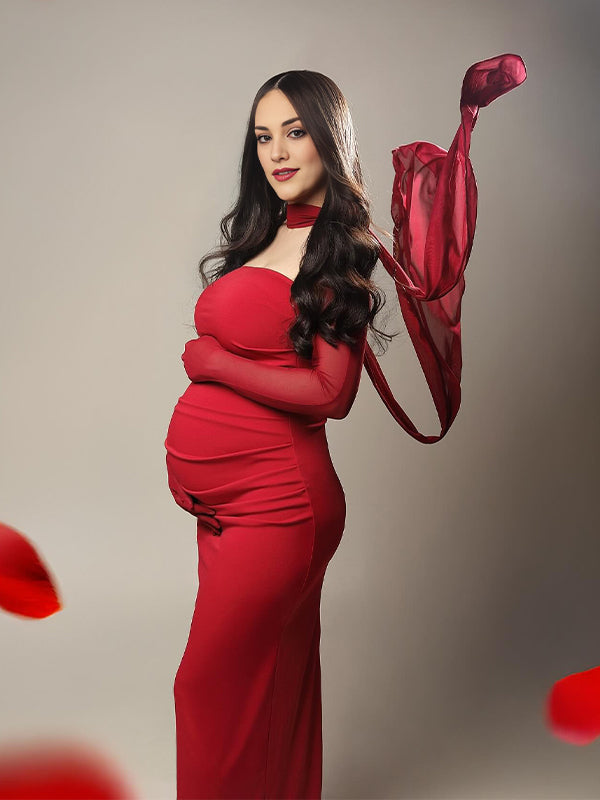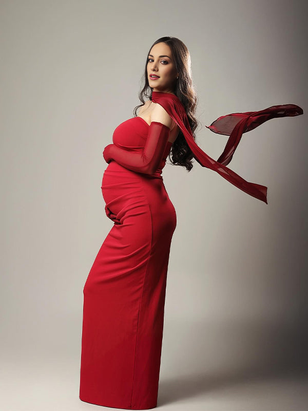 Ruched Wrap Mesh Gloves Back Slit Photoshoot Maternity Maxi Dress