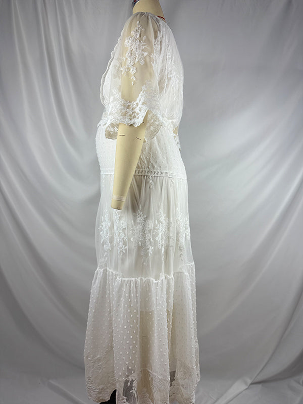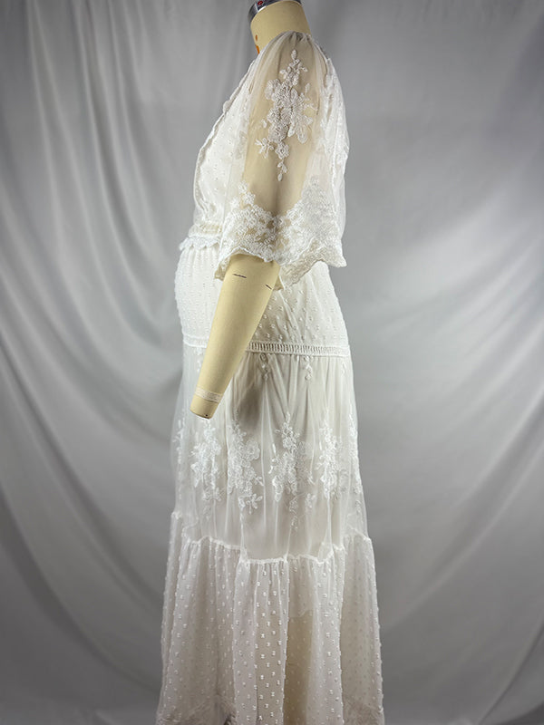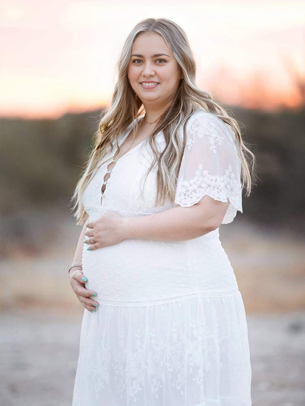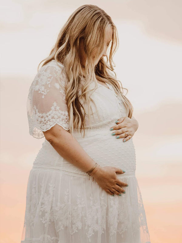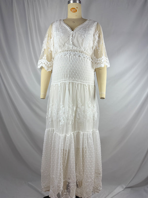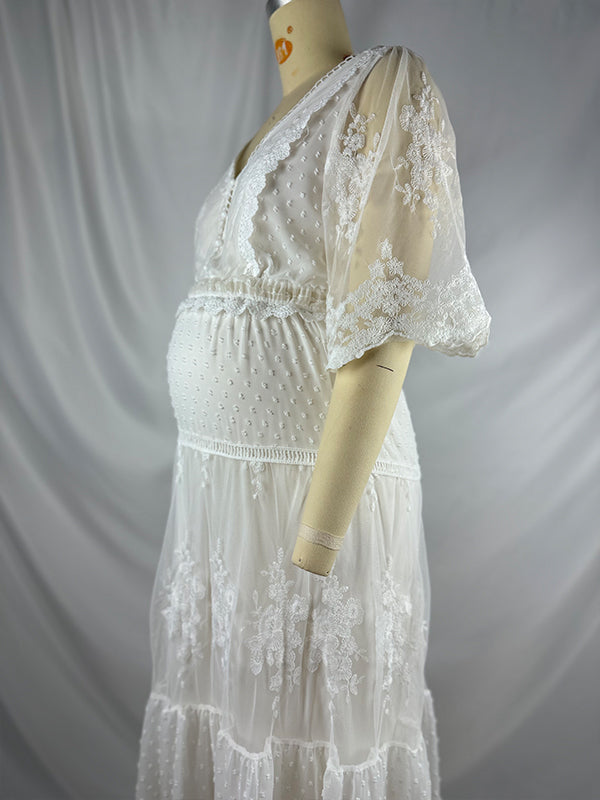 Momyknows White Lace Ruffle Embroidery Boho Plus Photoshoot Maternity Maxi Dress