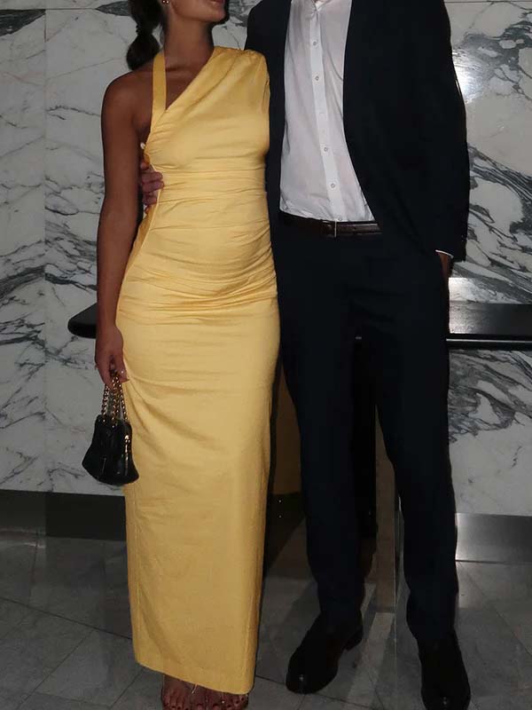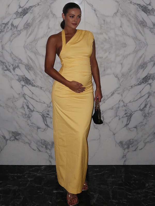Yellow Asymmetric Shoulder Ruched Maternity Baby Shower Maxi Dress