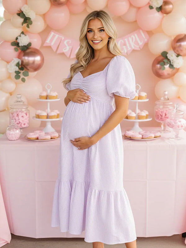 Momyknows Striped Ruched Puff Sleeve A-line Boho Maternity Maxi Dress