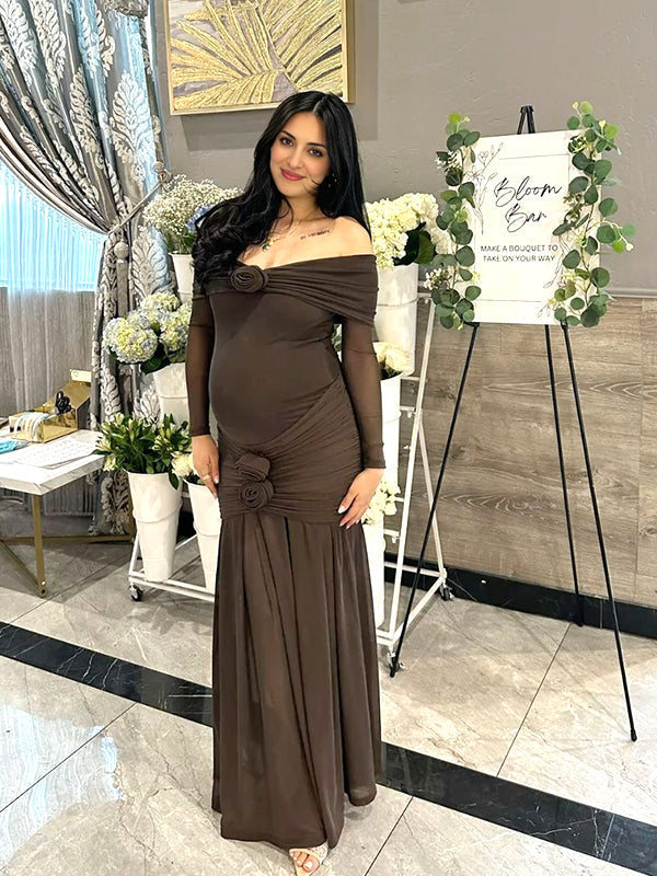 Momyknows Off Shoulder 3D Flowers Maternity Baby Shower Maxi Dress