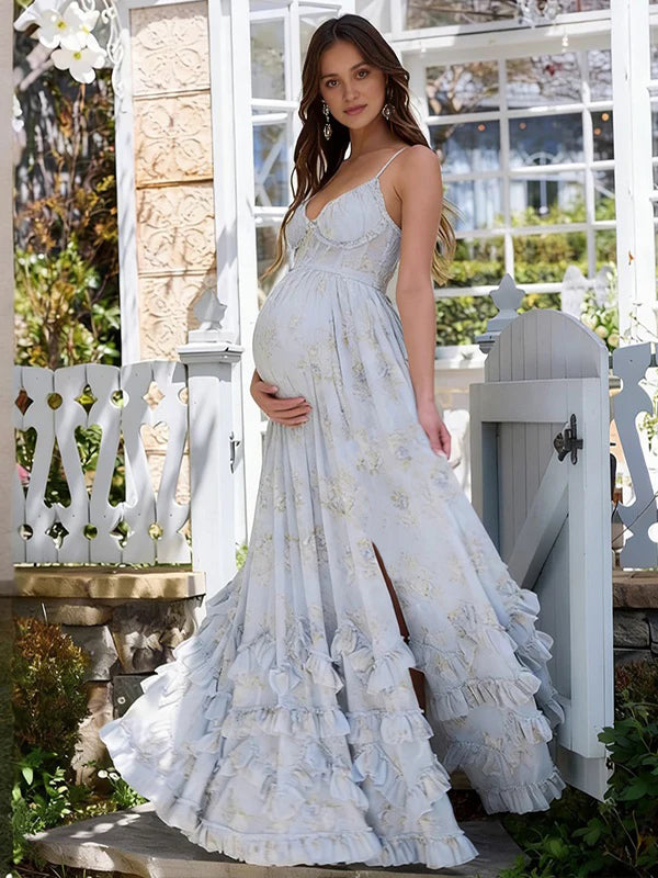 Momyknows Spaghetti Straps Side Slit Ruffle Maternity Photoshoot Maxi Dress