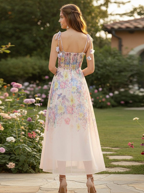 Momyknows Smocked Print Flower Spaghetti Strap Sheer Maternity Photoshoot Maxi Dress