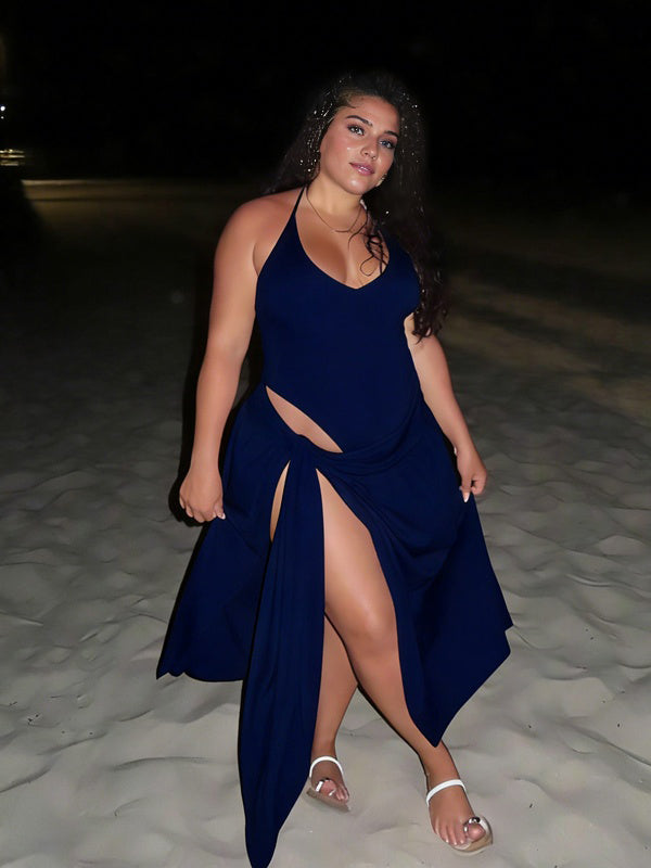 Momyknows Navy Blue Lace Up Side Slit Two Piece Maternity Photoshoot Maxi Dress