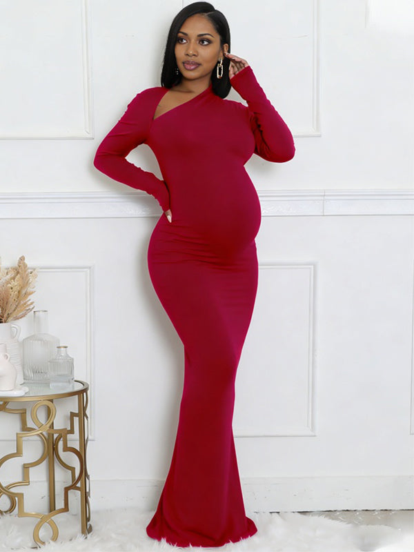 Momyknows Oblique Shoulder Side Slit Maternity Photoshoot Maxi Dress