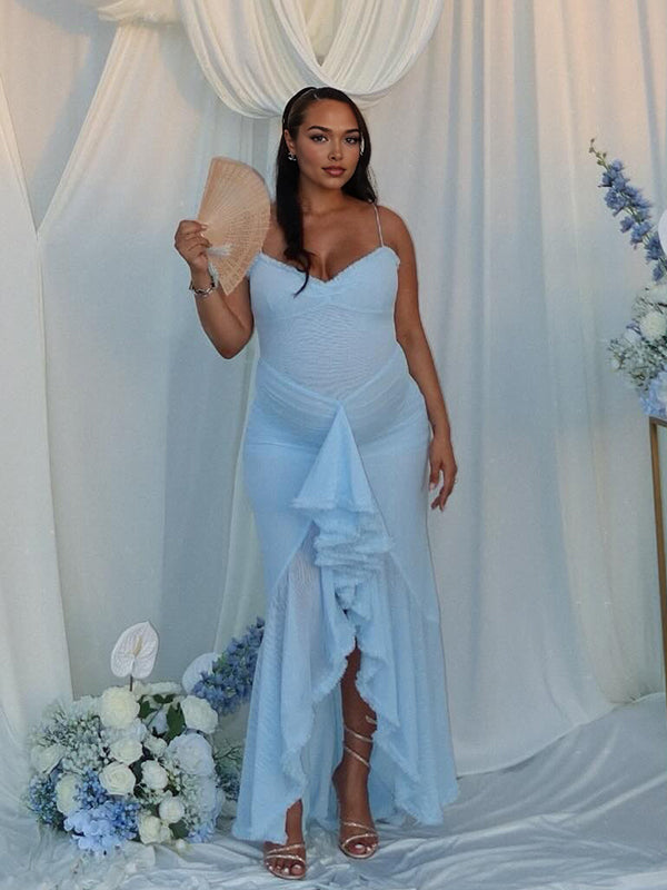 Blue Mesh Ruched Ruffle High-Low Mermaid Cami Elegant Maternity Maxi Dress