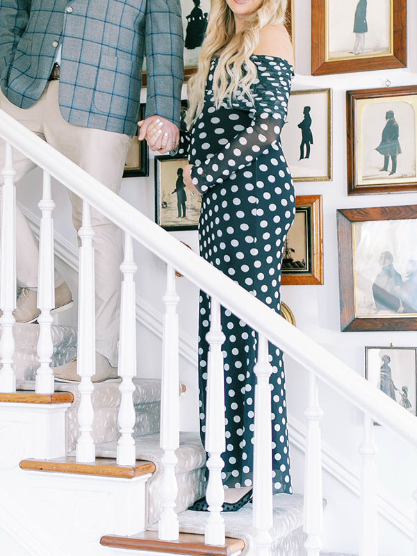 Momyknows Black And White Polka Dot Off Shoulder Ruched Bodycon Elegant Going Out Cocktail Maternity Photoshoot Maxi Dress