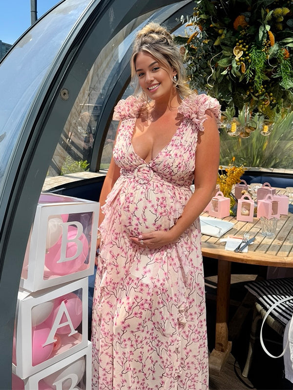 Momyknows Pink Ruffle 3D Flower Cut Out Halter Neck Elegant Maternity Maxi Dress