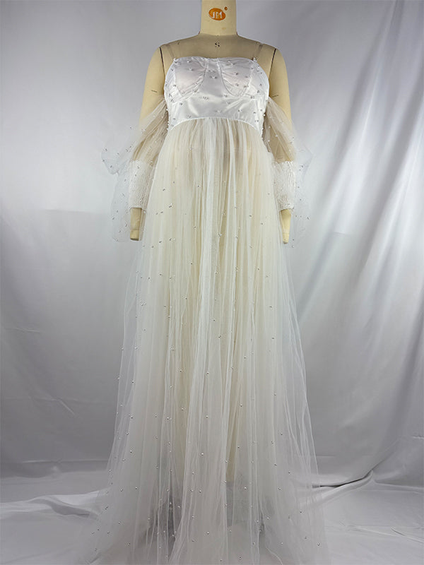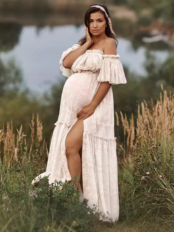 Momyknows Pearl Off Shoulder Front Open Slit Sheer Elegant Photoshoot Maternity Maxi Dress