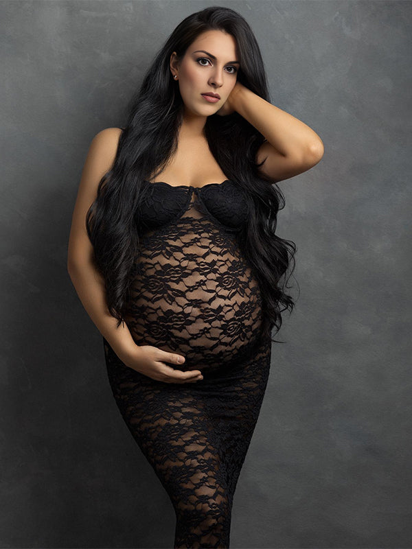 Momyknows Black Lace Back Slit Sheer Bodycon Elegant Photoshoot Maternity Maxi Dress