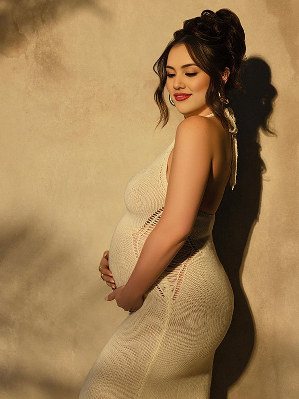 Momyknows Apricot Crochet Hollow Out Halter Neck Backless Bodycon Chic Baby Moon Beach Maternity Photoshoot Baby Shower Maxi Dress