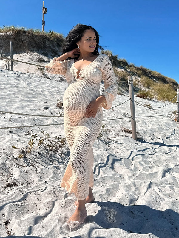Momyknows White Crochet Knit Hollow Out Deep V-neck Lantern Sleeve Bodycon Elegant Going Out Maternity Sweater Maxi Dress