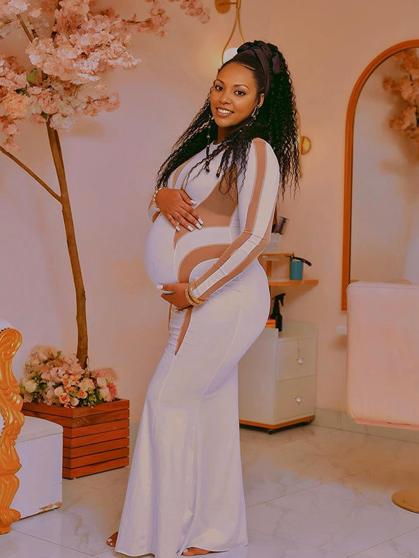 Momyknows White Mesh Patchwork Cut Out Mermaid Elegant Going Out Party Maternity Photoshoot Babyshower Maxi Dress