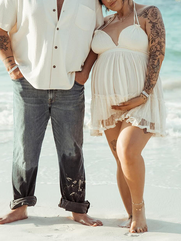 Momyknows Halter Neck Backless Mesh Splicing V-Neck Boho Photoshoot Maternity Mini Dress