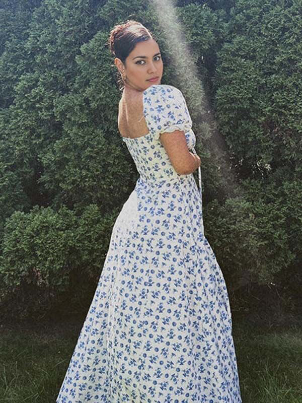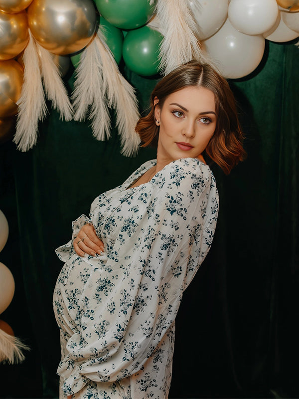 Momyknows White And Blue Print Flowers Front Slit Puff Sleeve Drawstring Elegant Maternity Baby Shower Maxi Dress