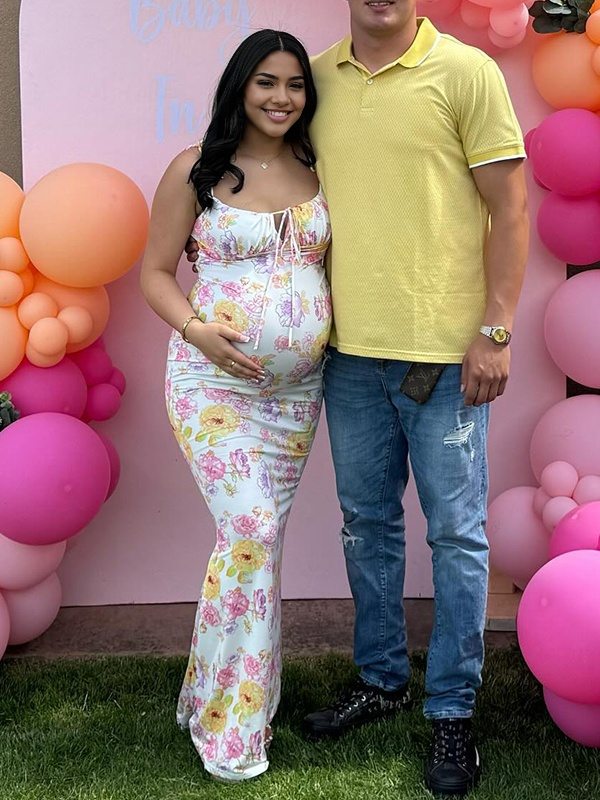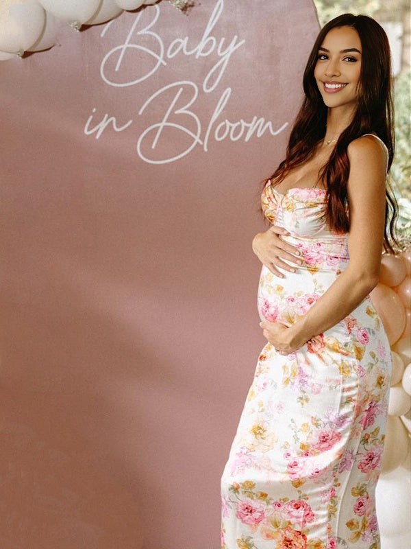 Beige Floral Back Slit Backless Baby Shower Maternity Maxi Dress