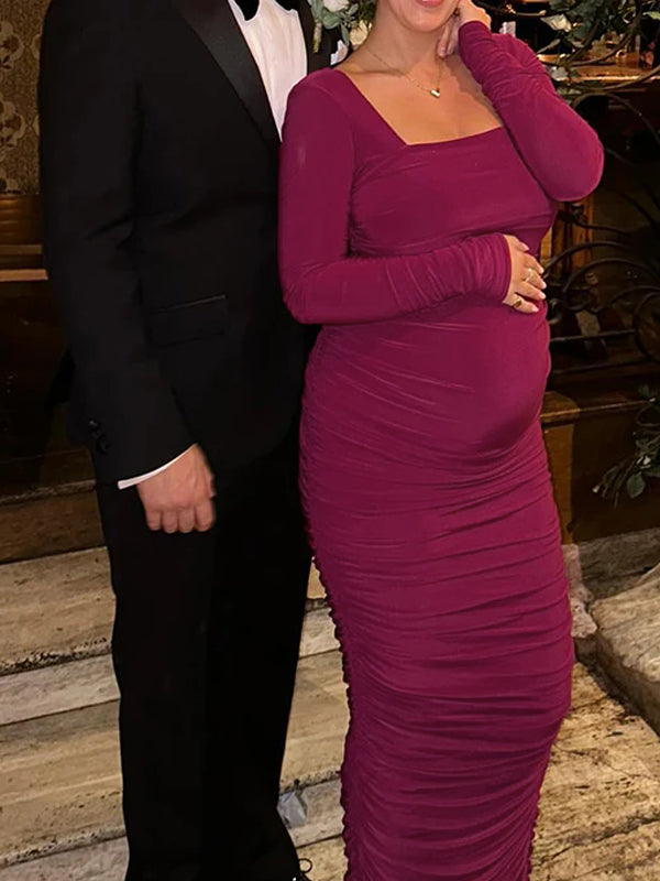 Momyknows Rose Carmine Ruched Square Neck Bodycon Elegant Party Baby Shower Maternity Maxi Dress