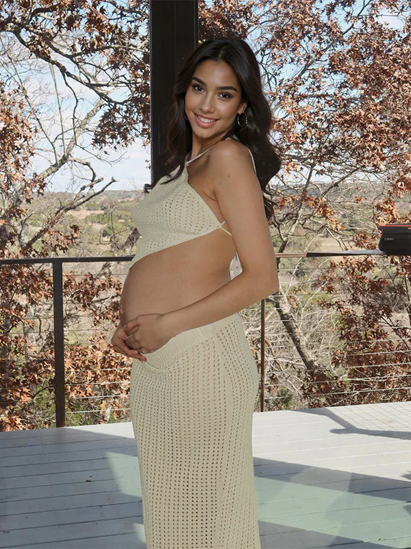 Momyknows Beige 2 Piece Halter Neck Crochet Fashion Beach Vacation Bodycon Maternity Maxi Dress