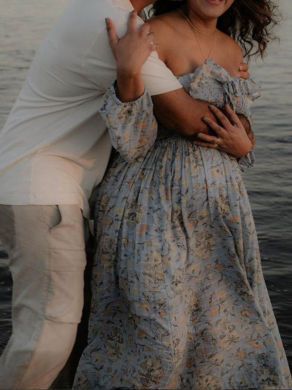 Momyknows Floral Smocked Ruffle Falbala Off Shoulder Big Swing Elegant Maternity Photoshoot Maxi Dress