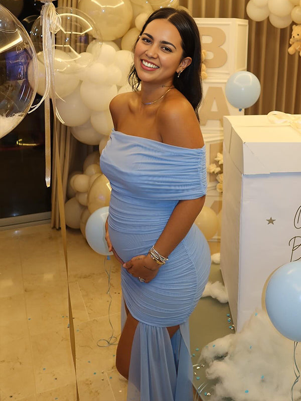 Momyknows Blue Mesh Ruched Off Shoulder Side Slit Maternity Maxi Dress