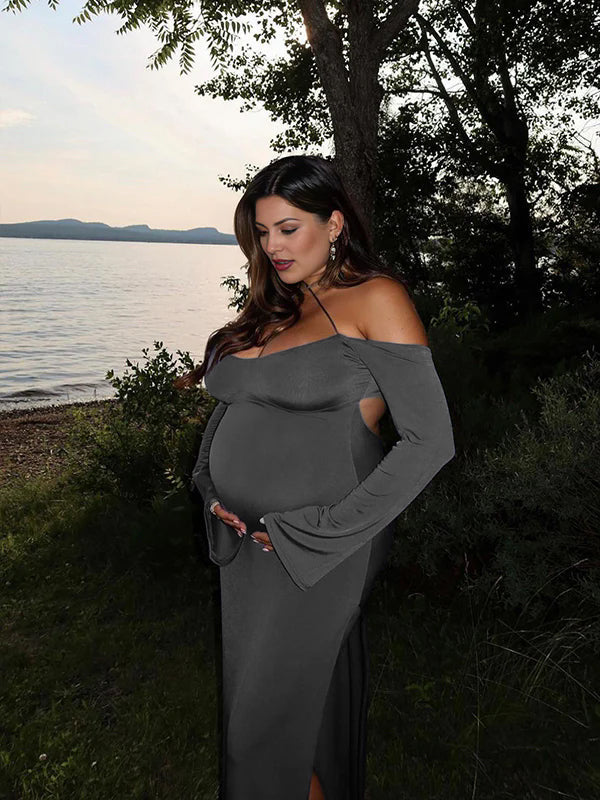 Momyknows Dark Grey Off Shoulder Cut Out Side Slit Backless Cami Flare Sleeve Chic Going Out Party Maternity Photoshoot Baby Shower Maxi Dress