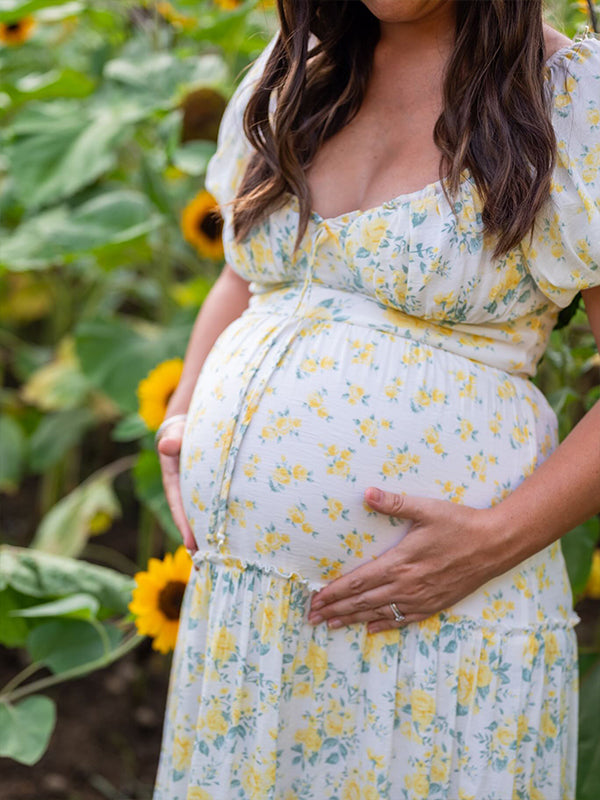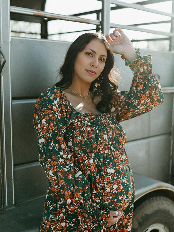 Momyknows Floral Lace-up Smocked Big Swing Boho Maternity Maxi Dress