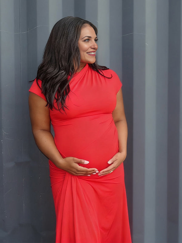Momyknows Red Round Neck Print Maternity Photoshoot Maxi Dress