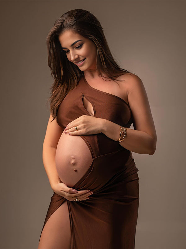 Momyknows Brown One Shoulder Cut Out Side Slit Photoshoot Maternity Maxi Dress