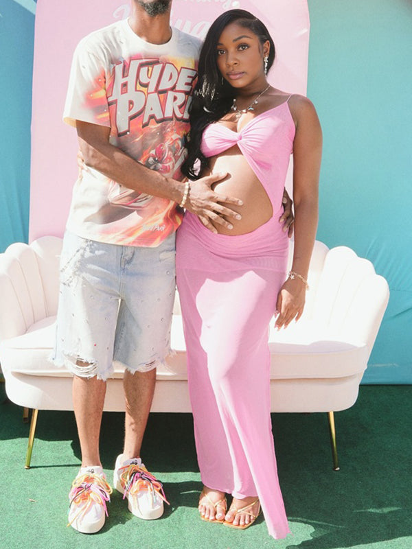 Momyknows Pink Spaghetti Strap Side Slit Maternity Baby Shower Maxi Dress