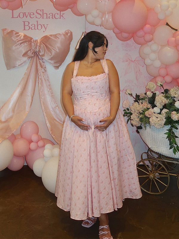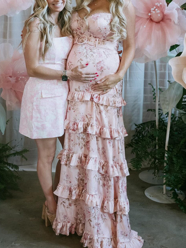 Momyknows Pink Floral Ruffle Back Tie Baby Girl Shower Maternity Maxi Dress