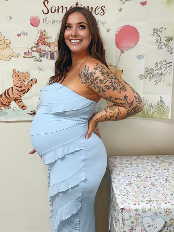 Momyknows Blue Ruffle Falbala Maternity Baby Shower Maxi Dress