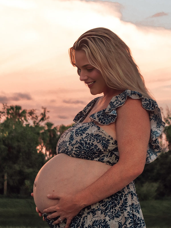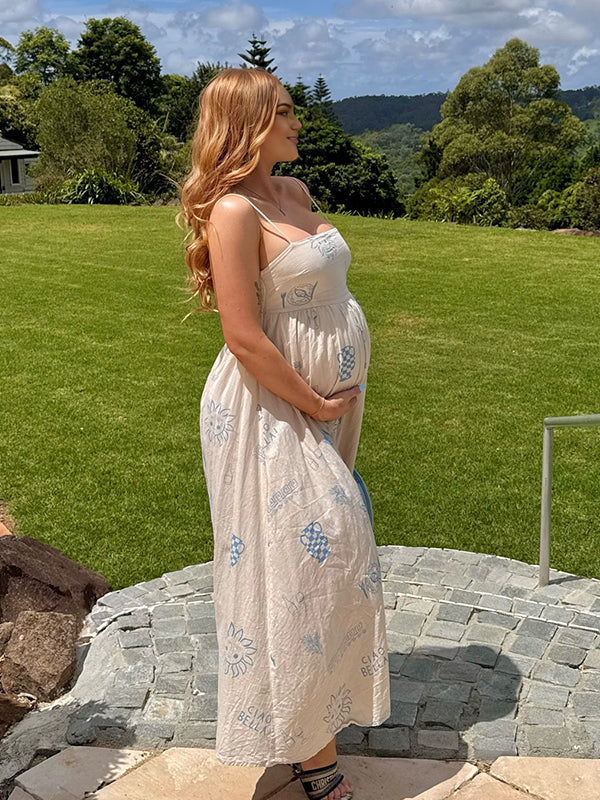 Momyknows Blue Print Spaghetti Strap Open Back Maternity Photoshoot Maxi Dress