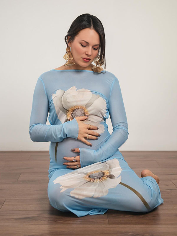 Momyknows Sea Blue Smocked Print Two Piece Maternity Photoshoot Maxi Dress