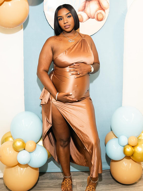 Momyknows Brown Satin One Shoulder Ruffle Side Slit Backless Maternity Maxi Dress