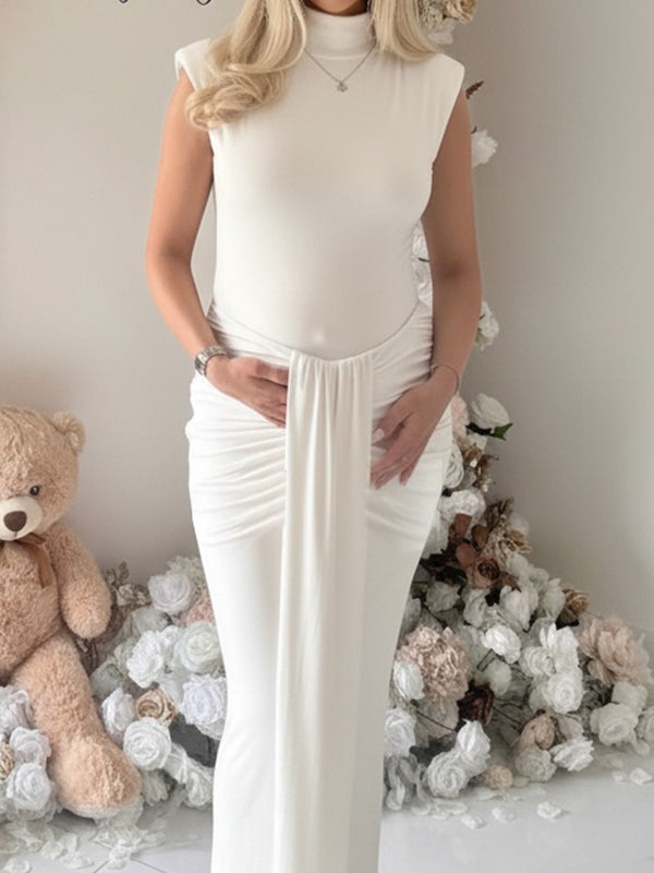 Momyknows White High Neck High Waisted Maternity Photoshoot Maxi Dress