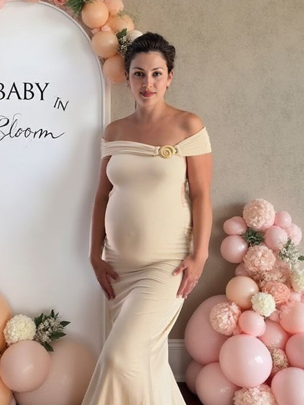 Momyknows Off Shoulder Ruched Metal Buckle Backless Mermaid Maternity Maxi Dress