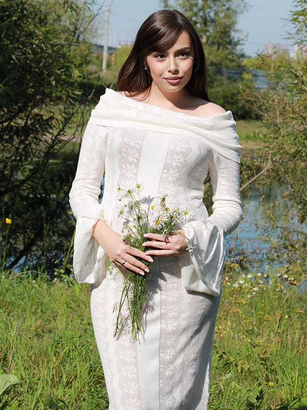 Momyknows White High Neck Crochet Maternity Photoshoot Sweater Maxi Dress