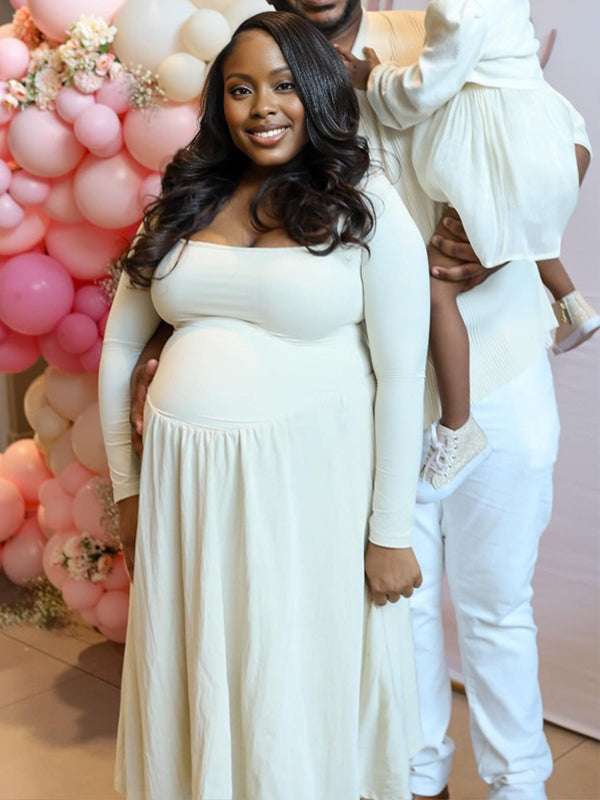 Momyknows White Ruched Hepburn Square Neck Maternity Baby Shower Maxi Dress