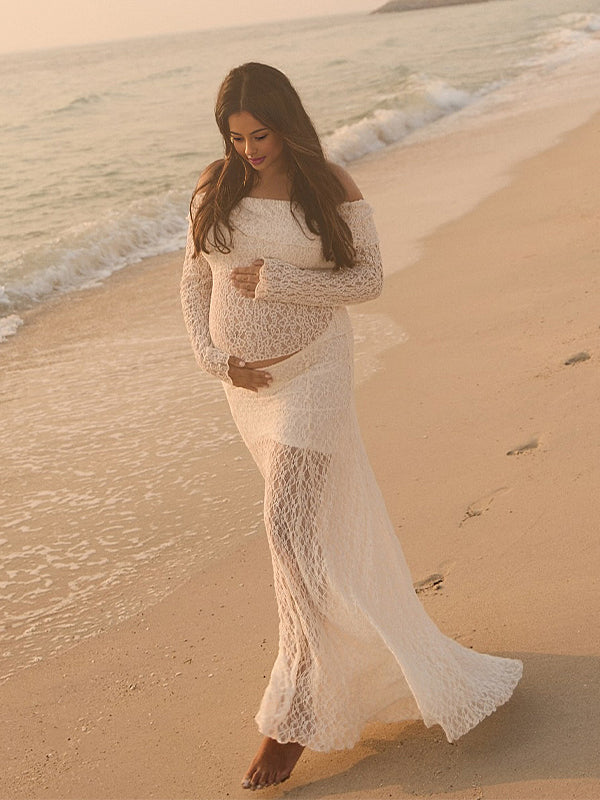 Momyknows Apricot 2 Pieces Off Shoulder Lace Photoshoot Maternity Maxi Dress