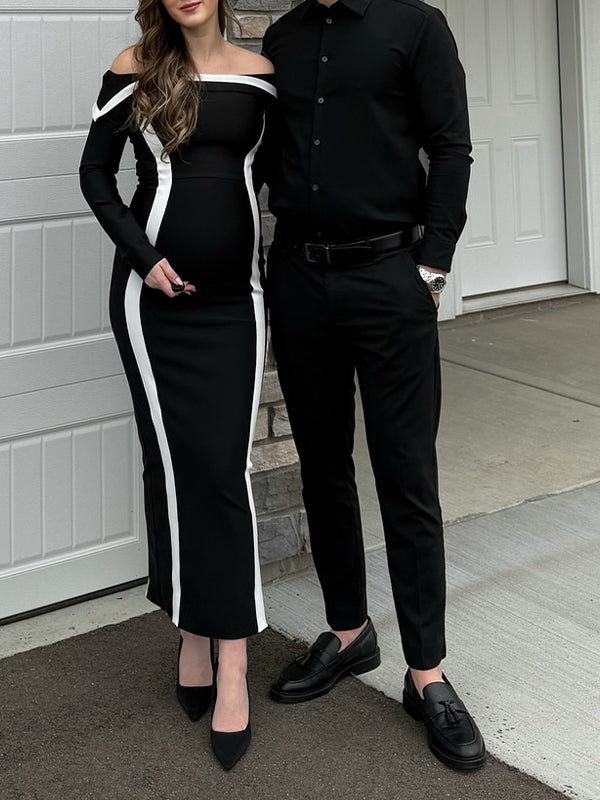 Momyknows Black Off Shoulder Lines Maternity Maxi Dress